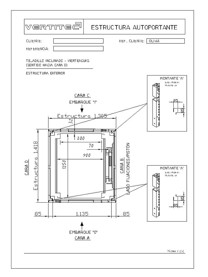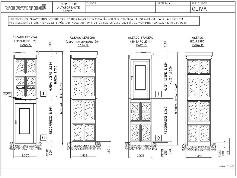 La cabina se hizo con el embarque doble a 180º y con medidas para que cupiera una silla de ruedas, facilitando así la entrada y salida del usuario. Juan, el arquitecto, replanteo el nivel del suelo para controlar, en caso de lluvia, que el agua no accediera dentro del hueco haciendo una inapreciable inclinación. Se aprovecho esta circunstancia también para poder disponer de un mínimo foso.